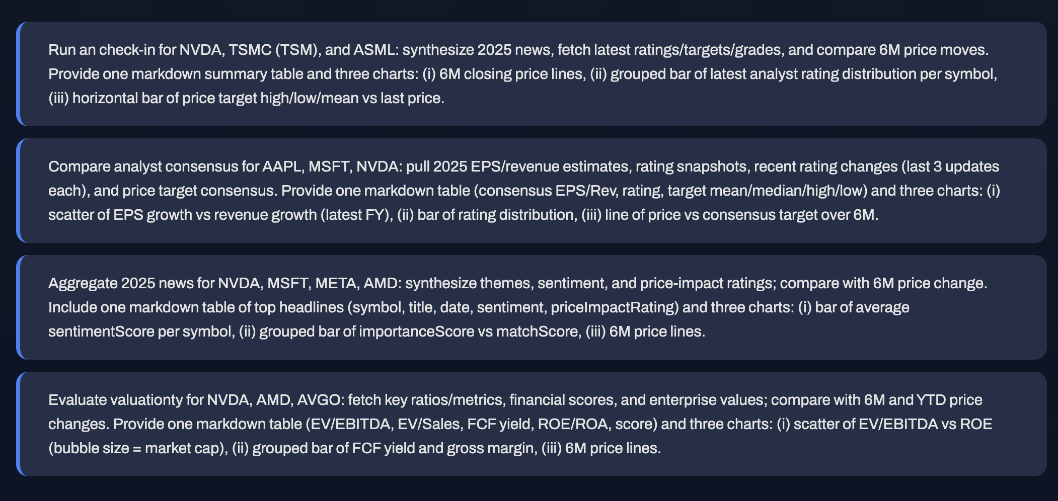 - Input: Price history, 10-K, 10-Q, transcripts, news